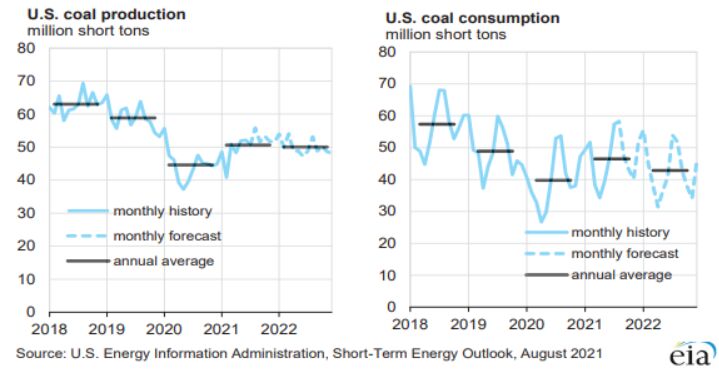 8月10日,美國能源信息署(EIA)發(fā)布最新《短期能源展望》報告顯示,2021年,美國煤炭產(chǎn)量預(yù)計為6.07億短噸(5.5億噸),同比增長13%,較前一月預(yù)期值減少1000萬短噸。 報告顯示,2022年,美國煤炭產(chǎn)量預(yù)計為6億短噸,較2021年預(yù)期值下降1.15%。