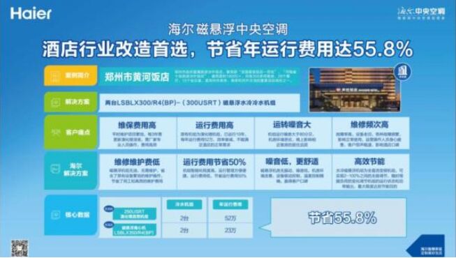 智慧節(jié)能 省電一半 原有空調(diào)體驗影響了酒店口碑,海爾通過改造方案實現(xiàn)了“雙贏”。原有機組為溴化鋰機組,已運行10年,效率衰減、噪音刺耳,故障頻發(fā)、維保費用高昂。海爾采用水冷磁懸浮機組進行改造,實現(xiàn)2%-100%無極變頻調(diào)節(jié),根據(jù)負荷變化調(diào)整冷量輸出。通過智能化機房管理,方便快捷、故障預警。既為酒店客人帶去安靜舒適的空調(diào)體驗,又為酒店運營方降低能耗,省電一半。 在體驗現(xiàn)場,用戶直觀感受到海爾磁懸浮機組的長效穩(wěn)定可靠。機組上方,1元硬幣立在紙牌塔尖屹立不倒。在講解人員手中,噪音分貝儀顯示數(shù)值為69,正常交流無障礙。在海爾E+物聯(lián)網(wǎng)磁懸浮空調(diào)的管理頁面上,嘉賓們看到,各項數(shù)據(jù)每隔6s自動記錄,機組運行狀態(tài)、能耗曲線及數(shù)據(jù)分析,都有不同界面進行云數(shù)據(jù)統(tǒng)計。 “提到磁懸浮,我們第一個想到的就是海爾。”在體驗結束后的交流討論中,有用戶表示,對噪音震動等可視化體驗印象深刻。在中央空調(diào)的選購過程中,尤為看中初期投資和運行費用,特別是節(jié)能運行。以海爾磁懸浮中央空調(diào)為核心的智慧節(jié)能解決方案,省電一半,既解決了節(jié)能降耗的難題,又通過智慧管理升級用戶體驗。