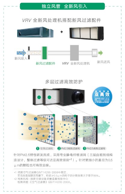 大金VRV全新風(fēng)處理機(jī),獨(dú)立風(fēng)道引入室外新鮮空氣,最大程度避免由于室內(nèi)空氣回風(fēng)混合引起的交叉感染問(wèn)題,同時(shí)可選配PM2.5過(guò)濾網(wǎng)、NO2、SO2過(guò)濾網(wǎng),凈化引入的室外空氣中的雜質(zhì)和污染物,在室內(nèi)形成清潔合理的新風(fēng)流動(dòng)場(chǎng)。
