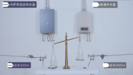 面對(duì)這類痛點(diǎn),什么樣的熱水器能夠解決呢?4月22日,卡薩帝官方平臺(tái)發(fā)布一段熱水器天平實(shí)驗(yàn)視頻。視頻顯示,卡薩帝「混動(dòng)」熱水器和普通熱水器在同時(shí)開(kāi)啟10分鐘后,工作人員用兩個(gè)量杯分別接10s熱水放在天平上。可見(jiàn),前者量杯中接出的水量多,天平朝前者傾斜。相同時(shí)間運(yùn)行的熱水器,為什么出水量不同?差別在于兩臺(tái)熱水器的科技不同。